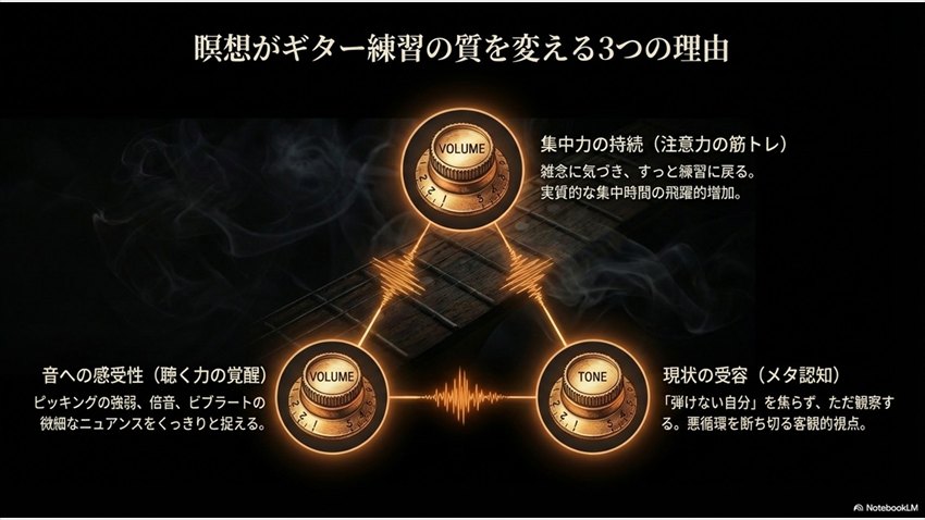 ここまでフルシアンテの話をしてきたけど、「すごいのはわかった。でも具体的に瞑想が練習にどう効くの?」と思っている人もいるはず。ここでは、瞑想がギター練習の質を変える理由を3つに整理して説明する。