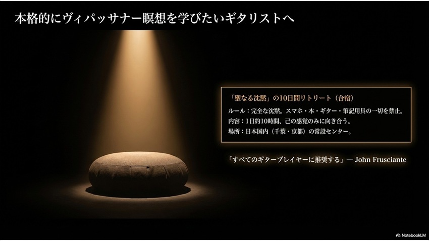 ジョン・フルシアンテが取り入れたヴィパッサナー瞑想法は、ギター練習の質を根本から変える可能性を持っている。30日かかっていたジミヘンのソロを2〜3日で記憶できるようになったのは、暗記力が上がったんじゃない。「音楽を感知する能力」が瞑想によって研ぎ澄まされた結果だ。