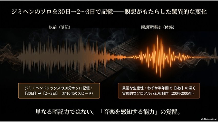瞑想によって「聴く力」が研ぎ澄まされると、音楽の中にある微細な構造――メロディの流れ、和音の色彩、リズムのうねり――がクリアに聞こえるようになる。ジミヘンのソロを「10分間の音の連続」として暗記するんじゃなく、「音楽の流れ」として体感的に理解できるようになった。だから30日が2〜3日に縮まったんだと思う。