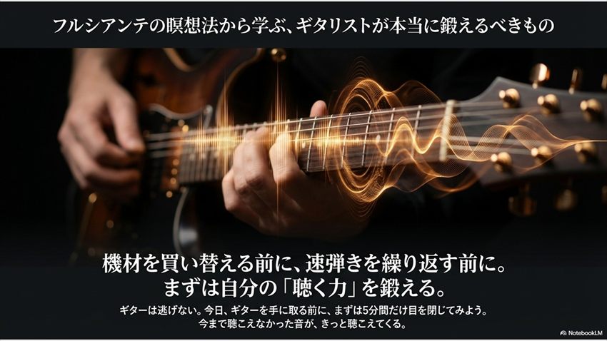 速弾きの練習やエフェクターの追加よりも先に、まず自分の「聴く力」と「集中力」を鍛えてみてほしい。それがフルシアンテの瞑想法から学べる、最も実践的な教訓だと思う。