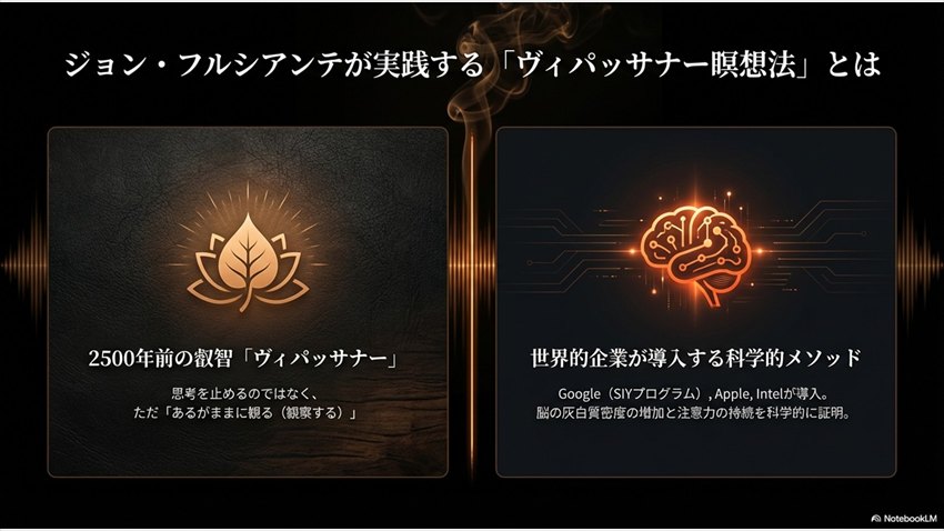 要するに、瞑想は「怪しい」のではなく「知られていない」だけなんだ。フルシアンテはそれを2500年前の伝統的な方法で取り入れた。Google社員はそれをモダンなプログラムとして取り入れた。形は違えど、やっていることの本質は同じ。「今この瞬間に意識を向ける練習」だ。